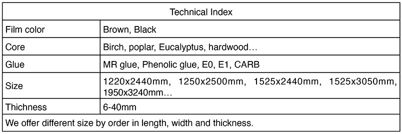 Film faced plywood is the special plywood with two sides coated with wearable and water proof film. The film is adhesive impregnated paper. The function of the film is to protect the inside wood from moisture, water, weather and extend the plywood’s service life. Film faced plywood can be used in harsh and outside environment: shuttering plywood, formwork plywood, concrete formwork, floorboard, vehicle building.
