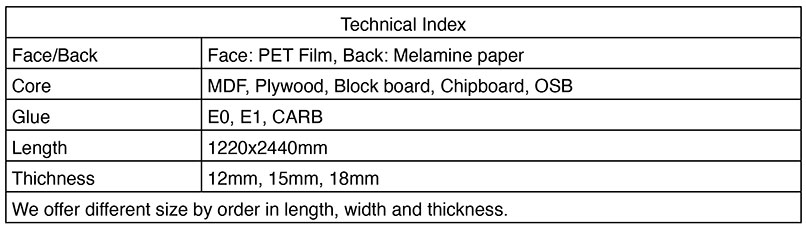 Booming bridge range of PET film faced boards are made from PET film pressed onto melamine wooden boards of different types, such as MDF, Chipboard, OSB. The resulting PET board is suitable for doors of furniture making and wall panelling.